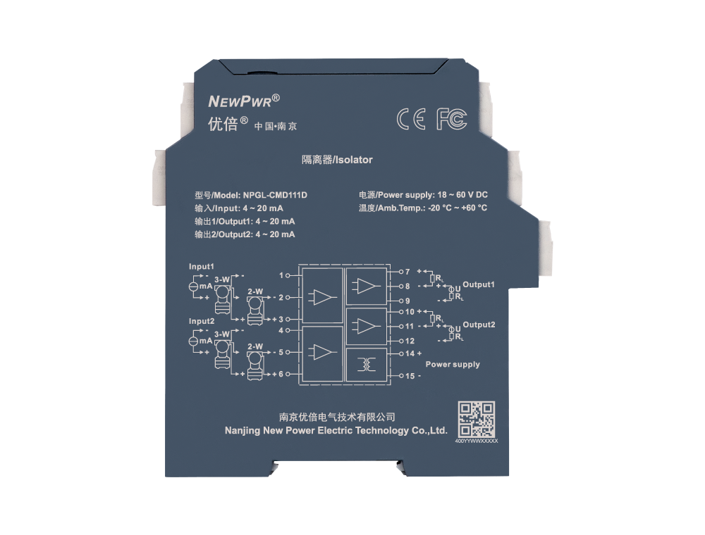 This isolator detects loop current and converts it to 4~20mA signals, and also provides transmitters with power. It allows transmission of HART communication signals. The input, output, and power supply are galvanically isolated from each other.