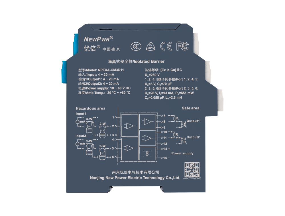 | 介電強度 | ≥ 3000 V AC (本安側與非本安側);≥ 1500 V AC (電源與非本安側) |